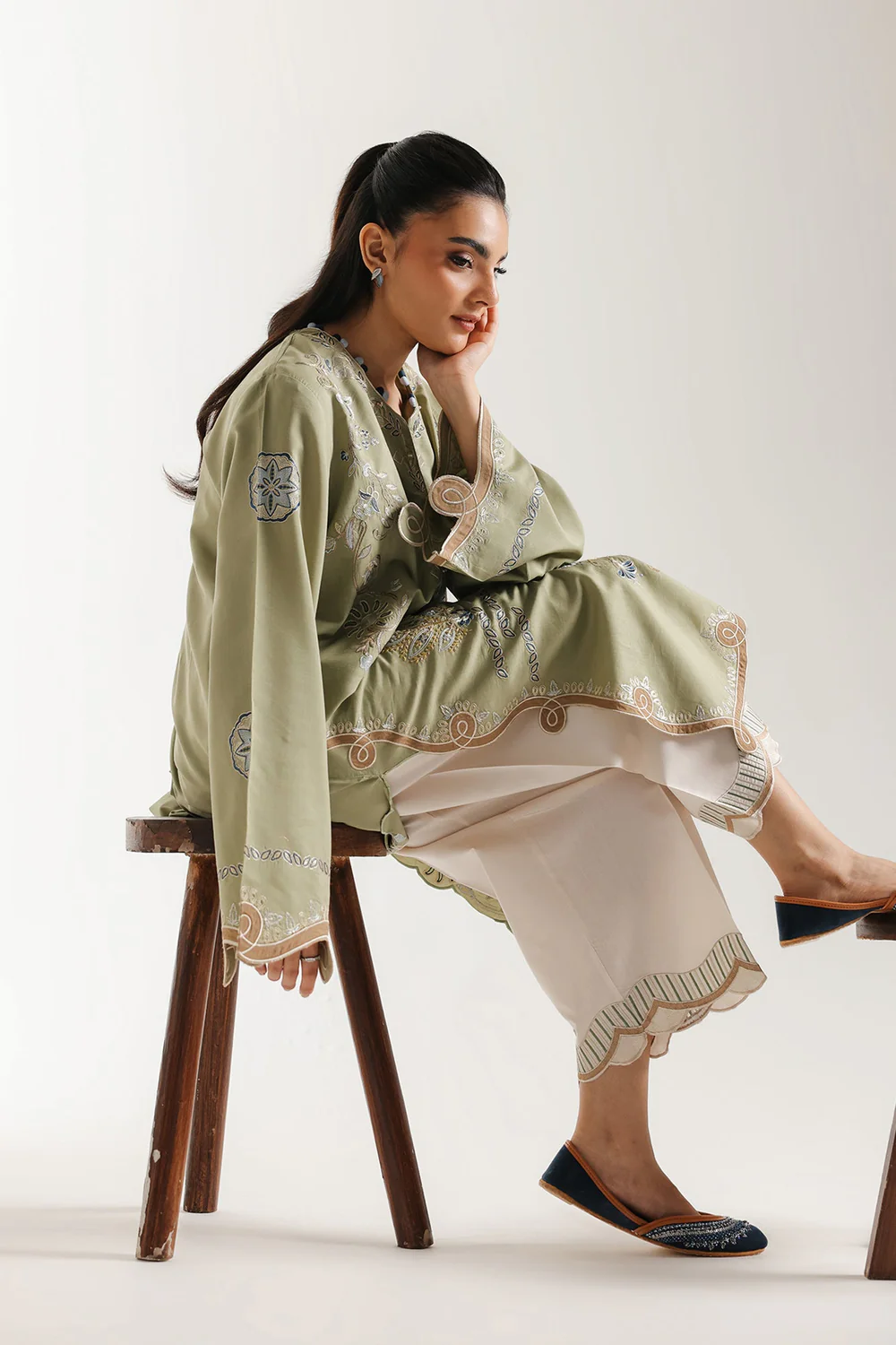 Dive into the rich depths of this embroidered suit. The long, A-line-cut kurta is a masterpiece of symmetrical design, featuring exquisite thread and cutwork embroidery in contrasting white and light blue. The embroidery forms striking columns of detailed floral and traditional motifs down the front panel. The V neckline, wide sleeves, and hem are all finished with delicate scalloped cutwork edges, adding an extra layer of artistry and dimension. The ensemble is perfectly completed by coordinating trouser that feature matching intricate embroidered and cutwork borders at the hem, ensuring a cohesive and sophisticated traditional look.