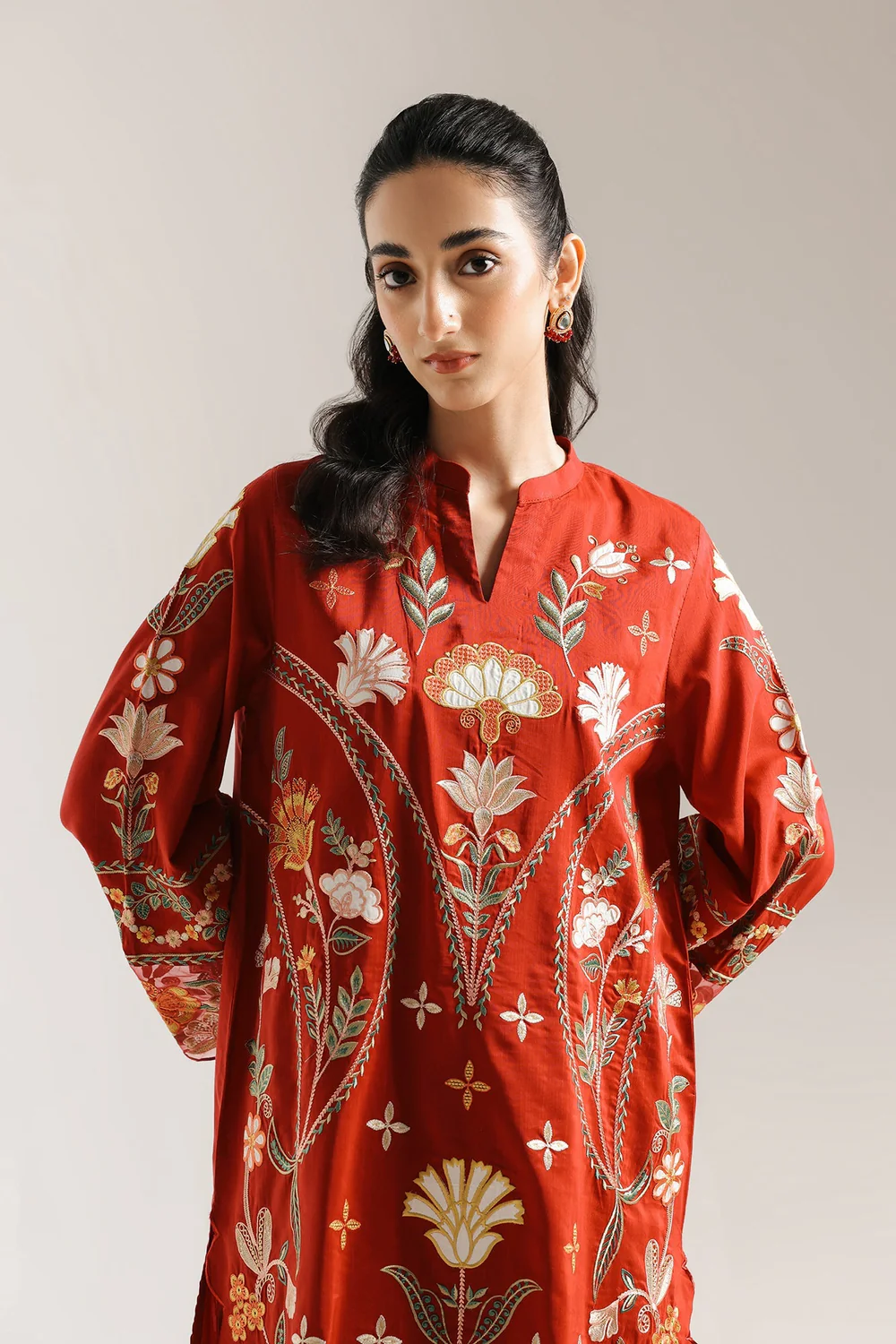 This exquisite suit is a beautiful showcase of masterful embroidery and a rich, bold color. The tunic, in a stunning shade of rust red, is a work of art, with intricate floral and botanical motifs embroidered in ivory, gold, and green. The detailed patterns cascade down the front and across the wide, flared sleeves, creating a captivating design. The tunic’s hem is finished with a graceful scalloped edge. The suit is completed with a matching shalwar that feature a broad, embroidered border at the bottom, creating a truly luxurious and cohesive look. This elegant ensemble is a perfect choice for a grand celebration or a festive occasion.