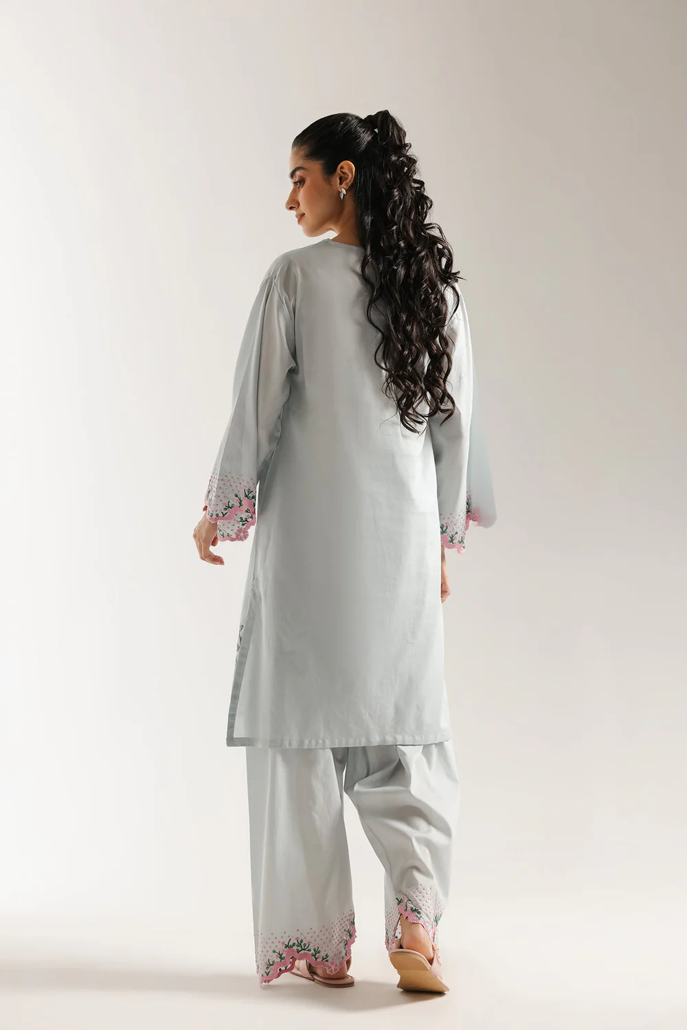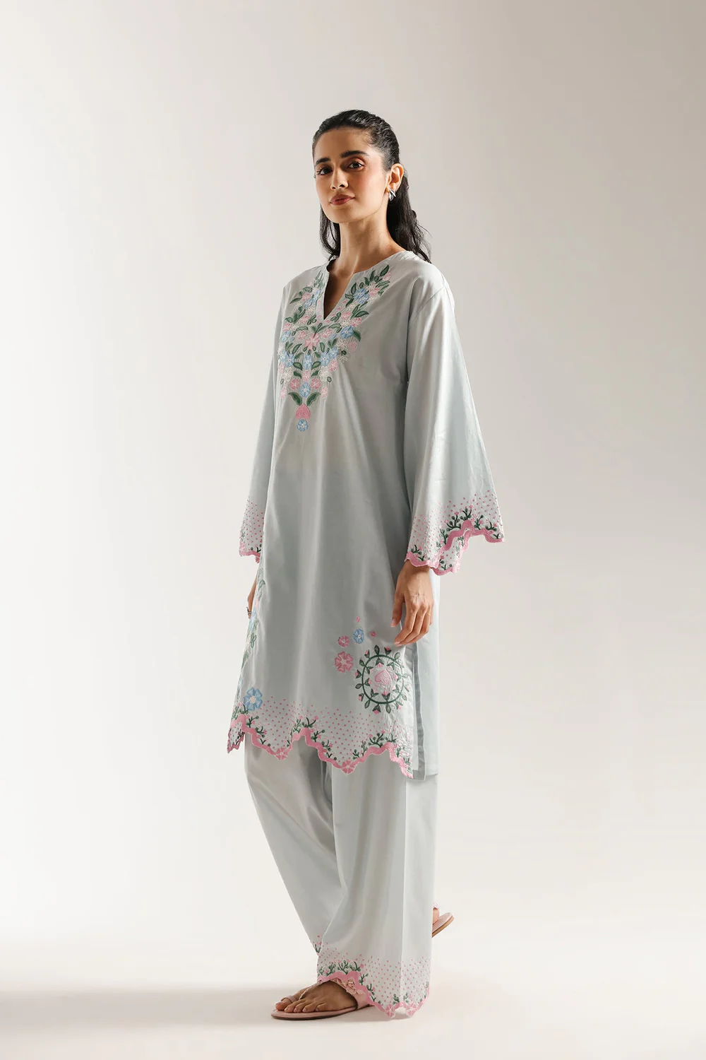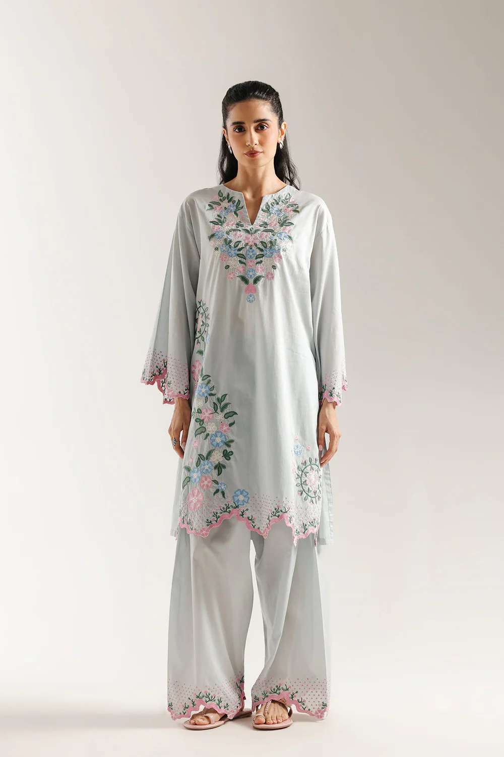 Breathe new life into your wardrobe with this charming embroidered suit. This two-piece ensemble features a delicate light blue kurta, beautifully adorned with intricate floral embroidery in soft pink, blue, and green hues that cascade elegantly down the front and hem. The wide, flowing sleeves are also trimmed with matching details, adding to its graceful appeal. Paired with coordinating wide-leg shalwar, which feature complementary embroidery at the hem, this suit creates a harmonious and captivating look perfect for any sophisticated occasion.