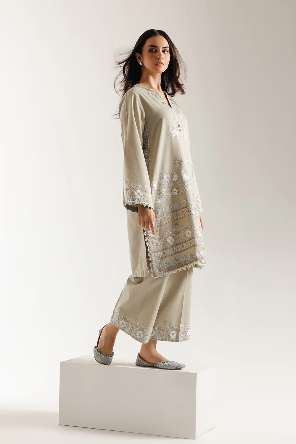 Step into classic sophistication with this beautifully embroidered suit. The crisp white fabric provides the perfect canvas for the intricate black embroidery, featuring elegant floral and vine patterns that flow across the shirt. The delicate lace trim along the neckline and cuffs adds a touch of refined femininity. The ensemble is completed with matching white trouser, creating a timeless and cohesive look. This suit is an ideal choice for a graceful, polished aesthetic, perfect for both formal and semi-formal occasions.
