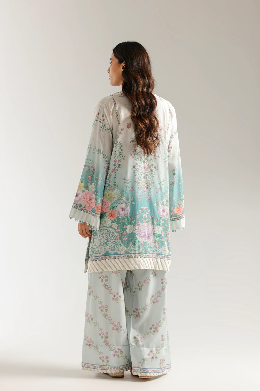 This graceful embroidered suit is a celebration of soft pastels and elegant floral motifs. The light blue kurta features a beautiful floral print in shades of pink, purple, and green, with subtle gotta work on hem and sleeves that adds a touch of sophistication. Paired with coordinating shalwar that have a complementary print, this ensemble creates a truly charming and refined look.