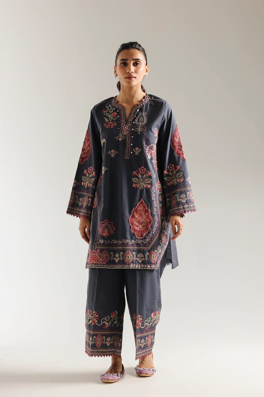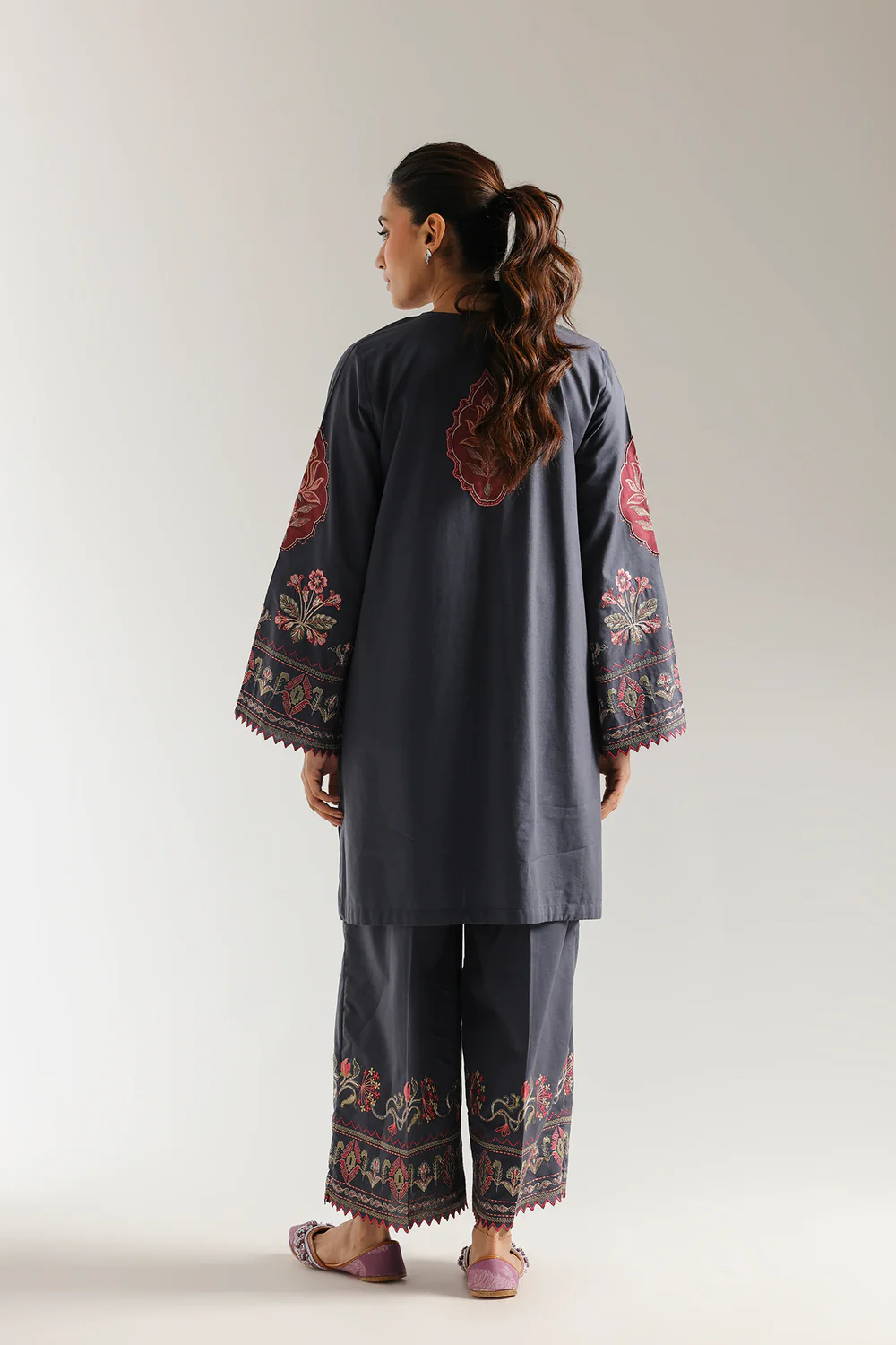 This exquisite embroidered suit is a masterpiece of rich color and intricate artistry. The deep navy blue kurta is beautifully adorned with bold floral and geometric embroidery in a vibrant palette of maroon, pink, and white. With a coordinating culotte trouser featuring a detailed embroidered hem, this ensemble creates a captivating and timeless look.