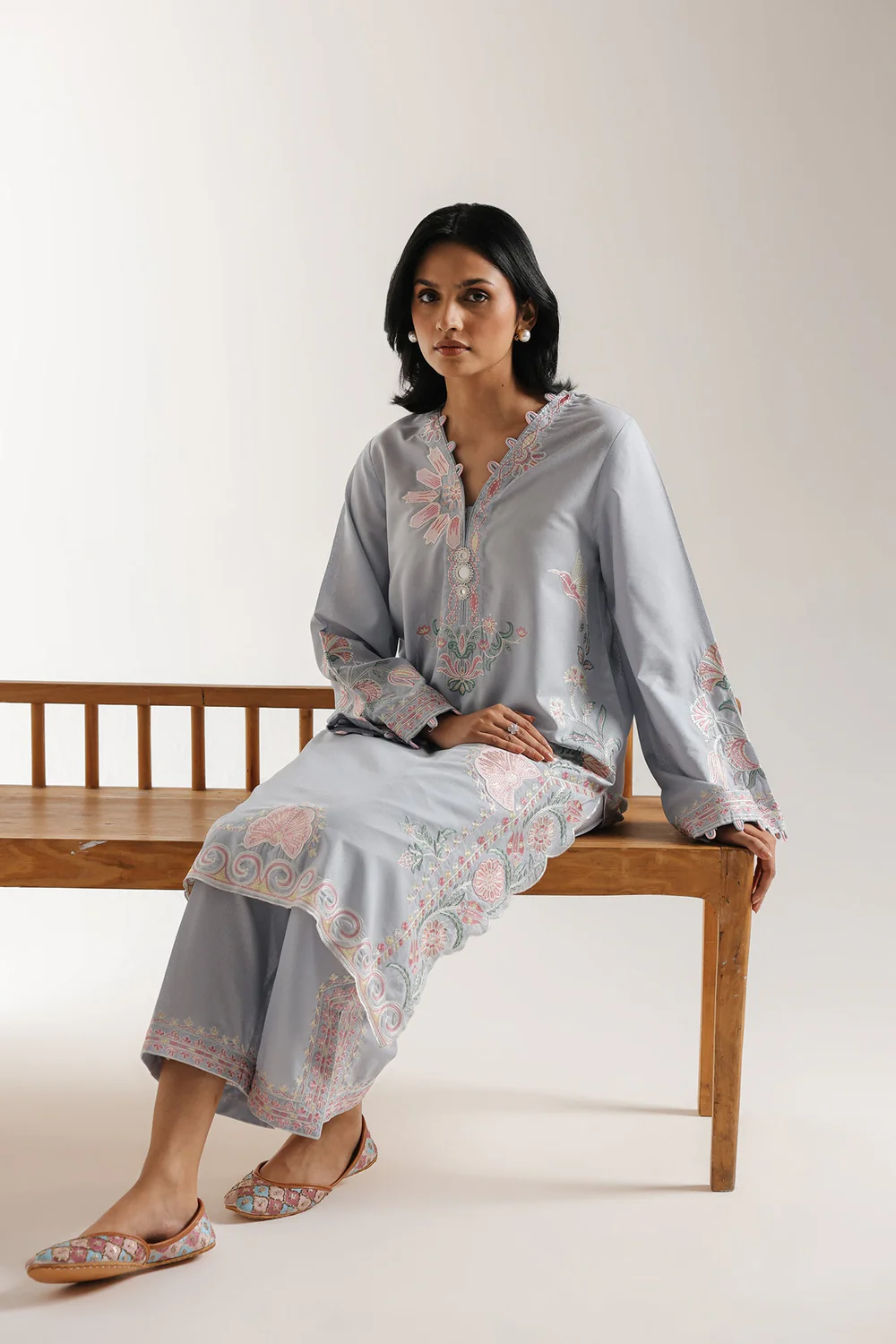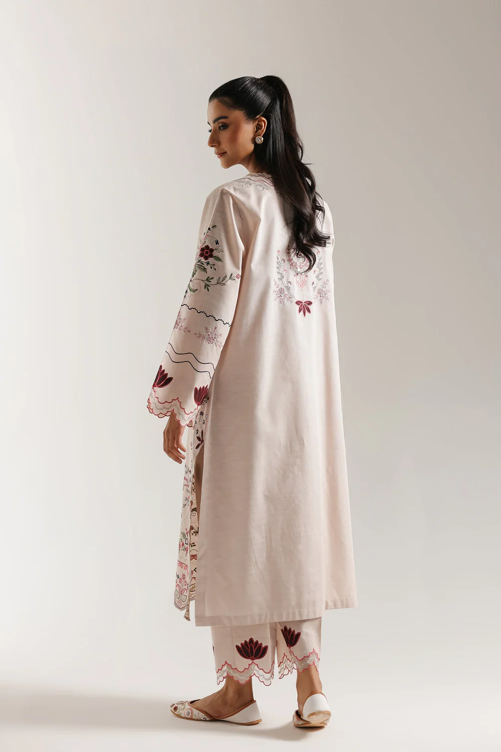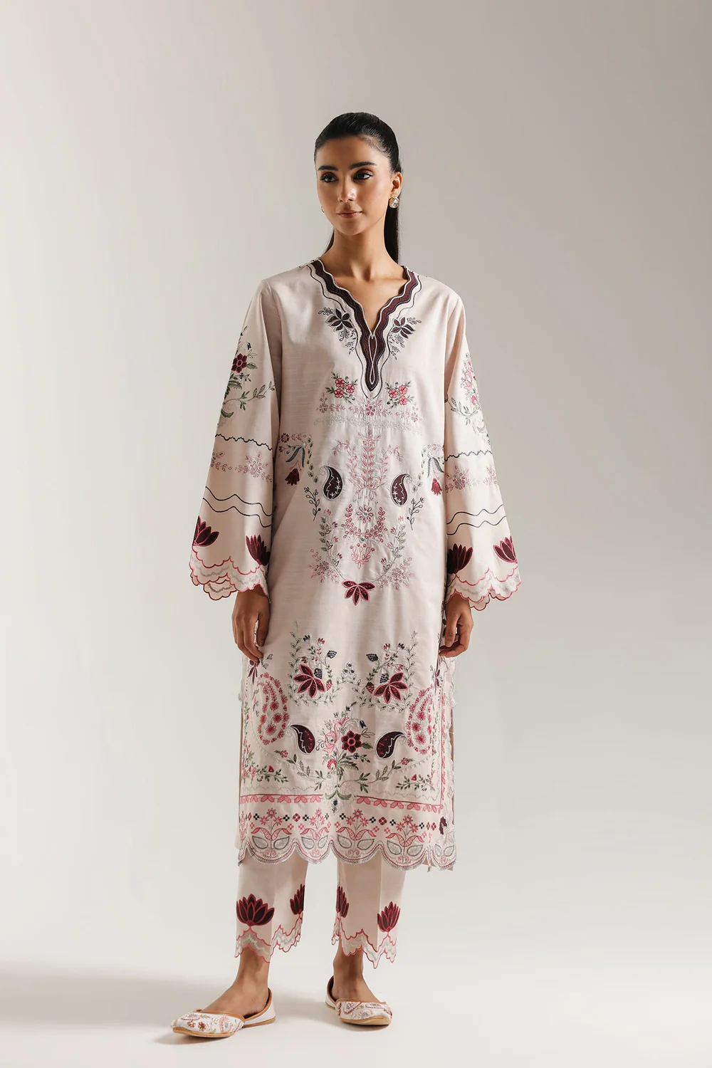 Drape yourself in feminine charm with this elegantly detailed embroidered suit. The ensemble features a long kurti and matching straight trouser crafted in a soft, delicate shade of pale coral. The shirt is richly embellished with intricate floral and paisley embroidery in deep maroon, wine, and soft green tones, which flows dramatically down the center front and along the hem. It features a V-neckline framed by a deep, embroidered border and wide sleeves with scalloped cuffs. The coordinating trouser carry a complementary ornamental embroidered motif near the hem. This sophisticated and beautifully balanced set is perfect for making a refined statement.