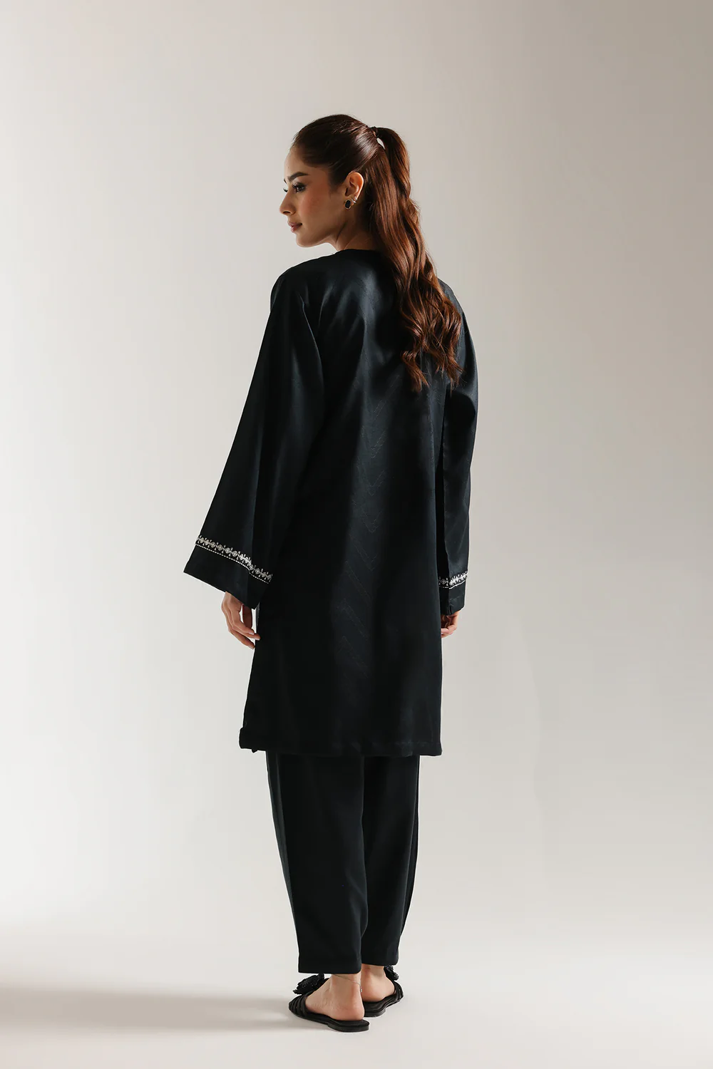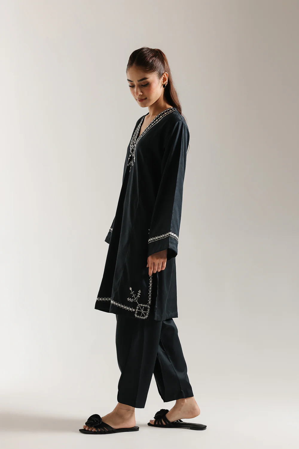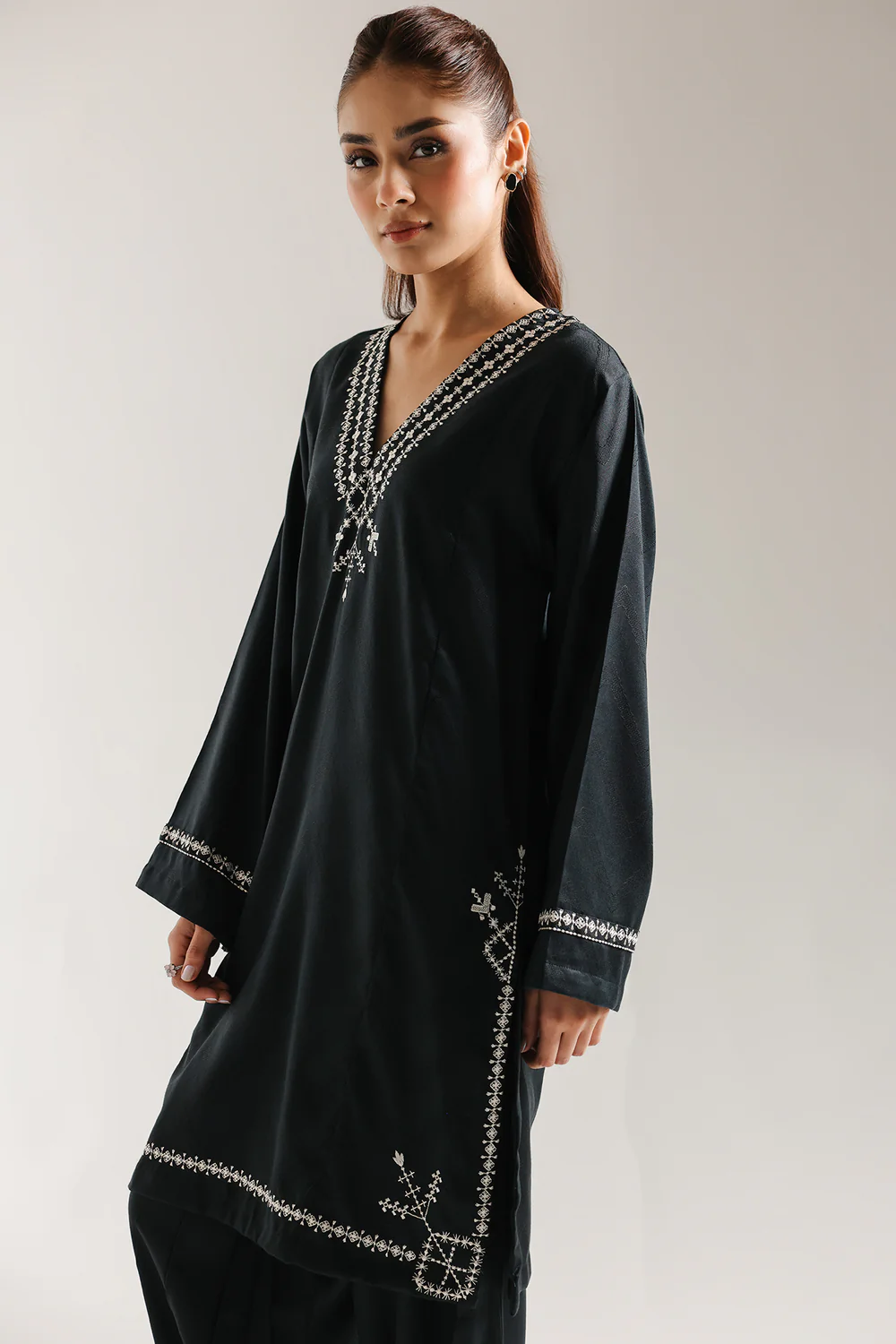 Step into sophisticated contrast with this striking black embroidered suit. The graceful, straight-cut kurta is crafted from a deep black fabric, providing a dramatic backdrop for the exquisite white thread embroidery. The intricate geometric and stylised floral patterns are concentrated around the V neckline, front hem and flared sleeves. The ensemble is completed by coordinating slouchy pleated trousers in the same deep black color. This suit offers a powerful, elegant, and perfectly coordinated elegant look.