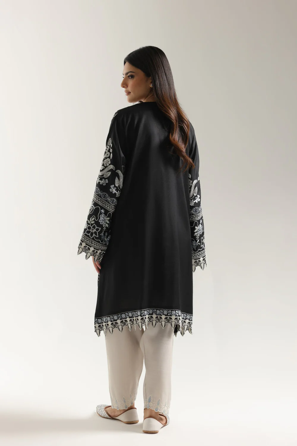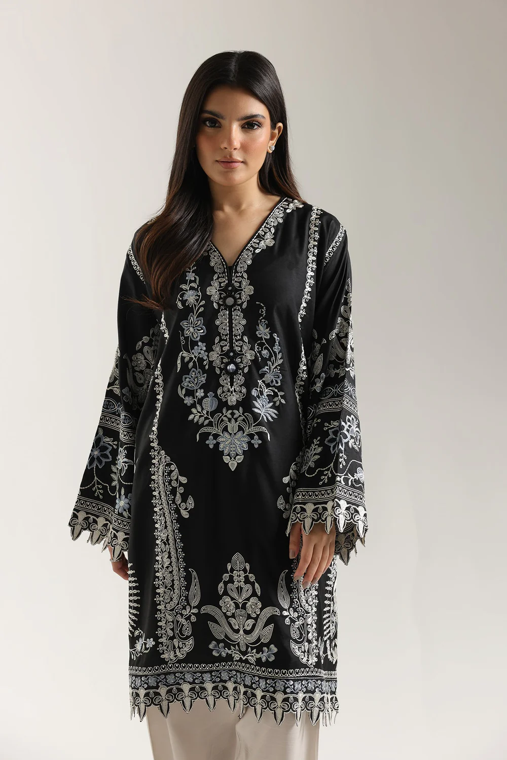 Dive into the depth of midnight with this strikingly monochrome embroidered suit. This sophisticated ensemble features a short-length kurti and matching shalwar, all crafted in a rich solid black fabric. The shirt is intricately detailed with ornamental embroidery in a blend of white, silver, and soft blue threads, forming stylized floral and paisley patterns down the center front and along the wide sleeves. It features a round neckline with a slit, accented by the central embroidery. The wide shalwar is finished with a wide, ornate geometric embroidered border at the hem, creating a powerful blend of classic color and intricate, modern artistry.