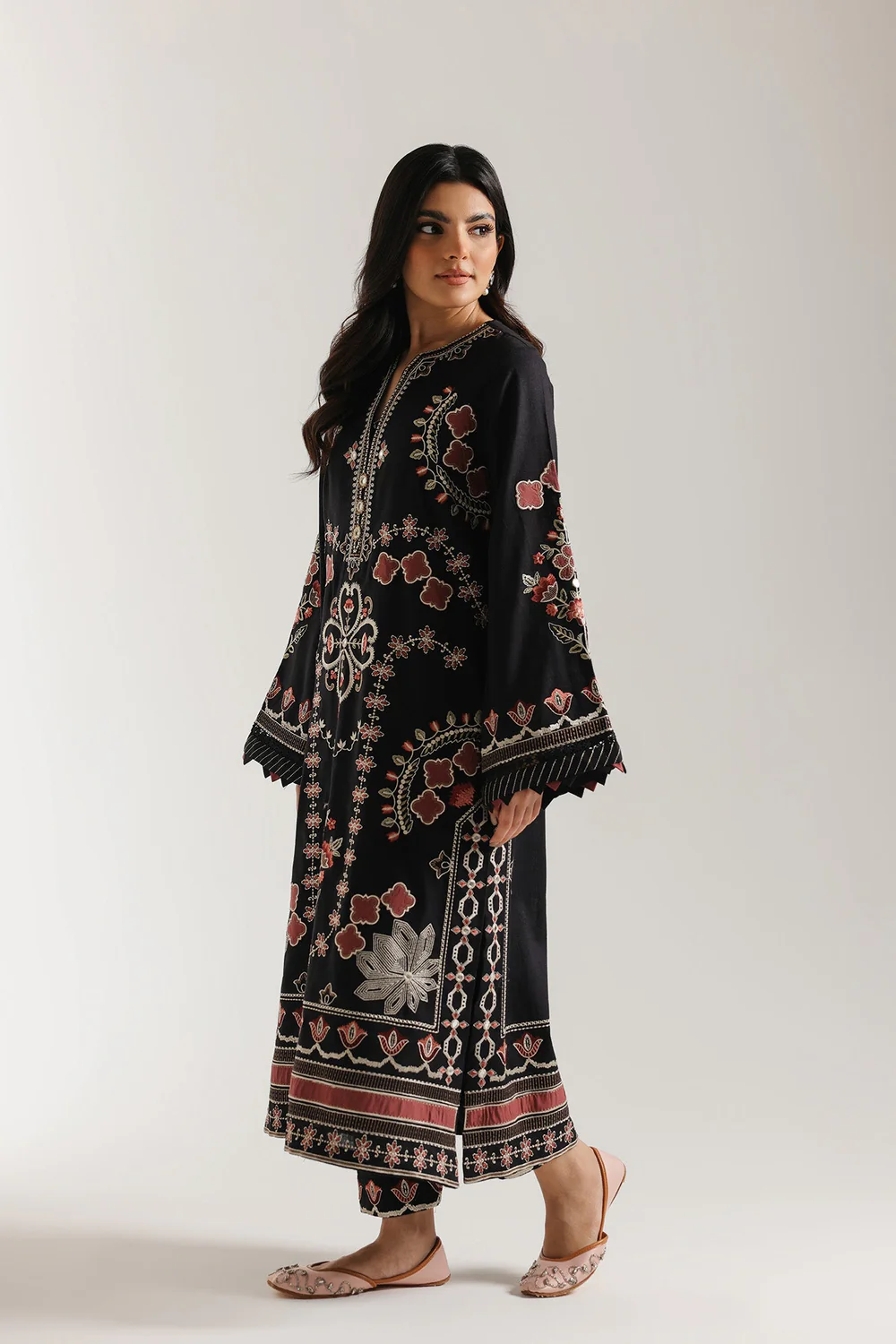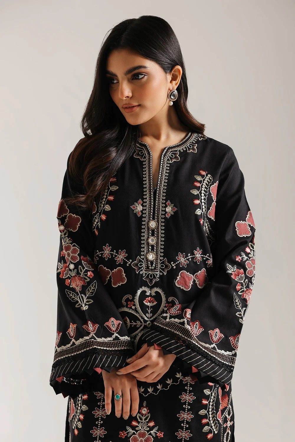 Elevate your wardrobe with this sophisticated embroidered suit featuring a black long shirt adorned with intricate embroidery throughout. The design features full sleeves with an elegant flair and a classic round neckline, enhanced by a refined slit detail. Paired with matching culottes that feature beautifully embroidered edges, this ensemble delivers timeless elegance with contemporary flair. Perfect for formal occasions and celebrations, the expert craftsmanship ensures a polished, refined appearance that captures traditional artistry with modern sensibility.