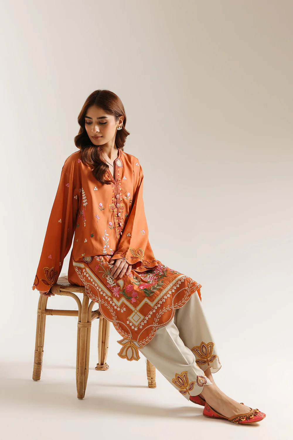 Elevate your wardrobe with this sophisticated embroidered suit, featuring an intricately detailed chak and front design on a classic round neck silhouette with full sleeves. The ornate embroidery work showcases traditional craftsmanship, while the coordinating plain shalwar with delicate scalloped edges provides refined balance. This ensemble combines timeless elegance with expert tailoring, perfect for both formal occasions and elevated everyday wear. -Pale Orange Color