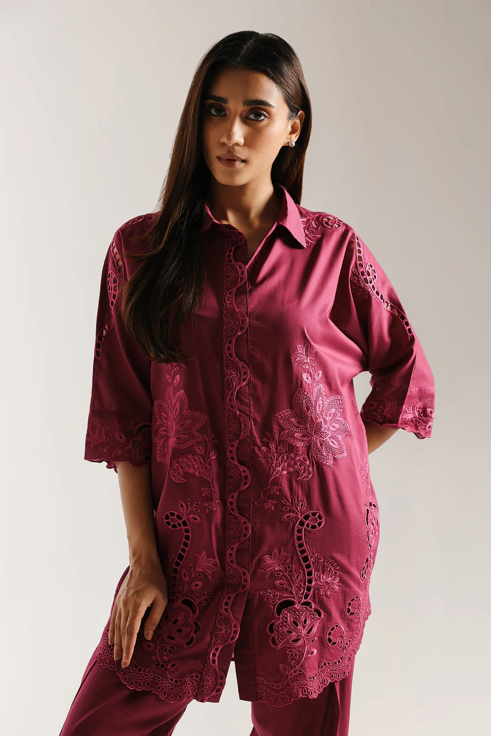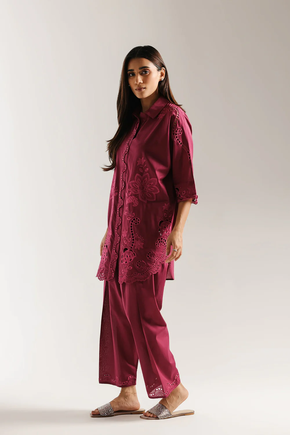 Make a bold statement with this vibrant embroidered suit. This two-piece ensemble features a rich magenta kurta beautifully detailed with intricate cutwork and embroidery in large floral patterns down the front and on the sleeves. The clean, button-down silhouette is complemented by matching loose fit shalwar creating a cohesive and contemporary look. This suit is a stunning choice for anyone who wants to combine classic elegance with modern flair.