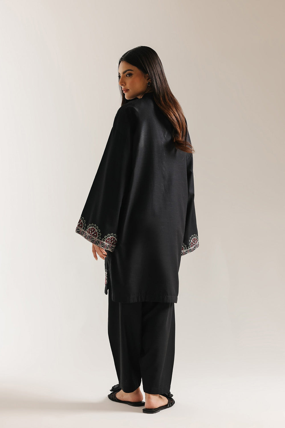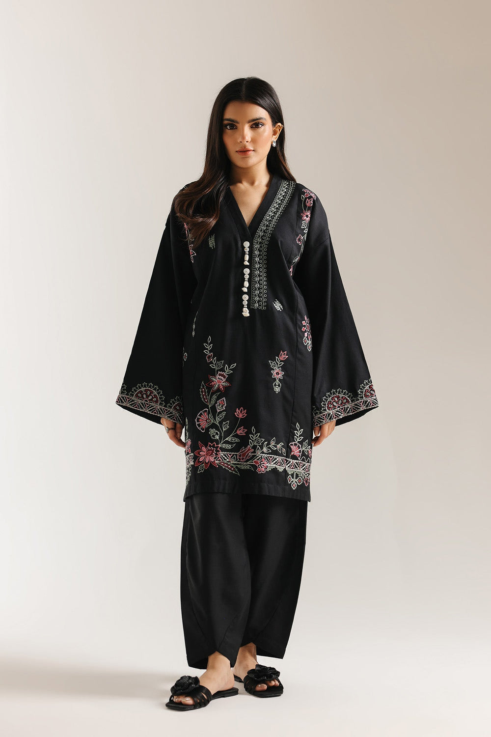 This graceful ensemble brings together traditional craftsmanship and modern style. The black outfit features beautiful white embroidery with soft pink floral designs that catch the eye. The shirt is crafted in a trendy kurta silhouette that add elegance, while the careful embroidery shows skilled handiwork passed down through generations. The tulip silhouette shalwar completes the look with a contemporary touch. Wear this suit to casual events or any special occasion where you want to look polished and impressive.