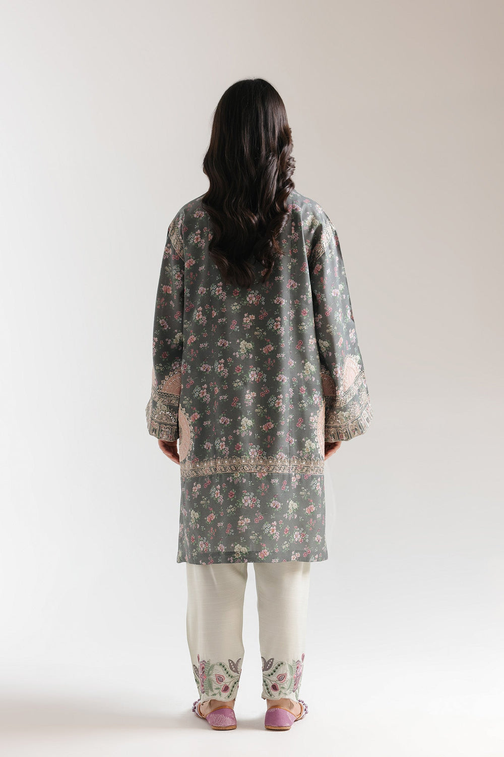 Elevate your ethnic wardrobe with this sophisticated embroidered suit, expertly crafted for timeless elegance. The knee-length kurta features a refined, muted charcoal or slate green base adorned with an intricate all-over floral print in soft pinks, roses, and delicate green accents. A classic V-neck with decorative button placket and contrasting patterned borders at the sleeves and hemline showcases meticulous attention to detail. Paired with light off-white or pale sage trousers finished with embroidered floral cuffs that echo the kurta’s design, this is perfect for formal occasions, celebrations, or everyday refined wear.