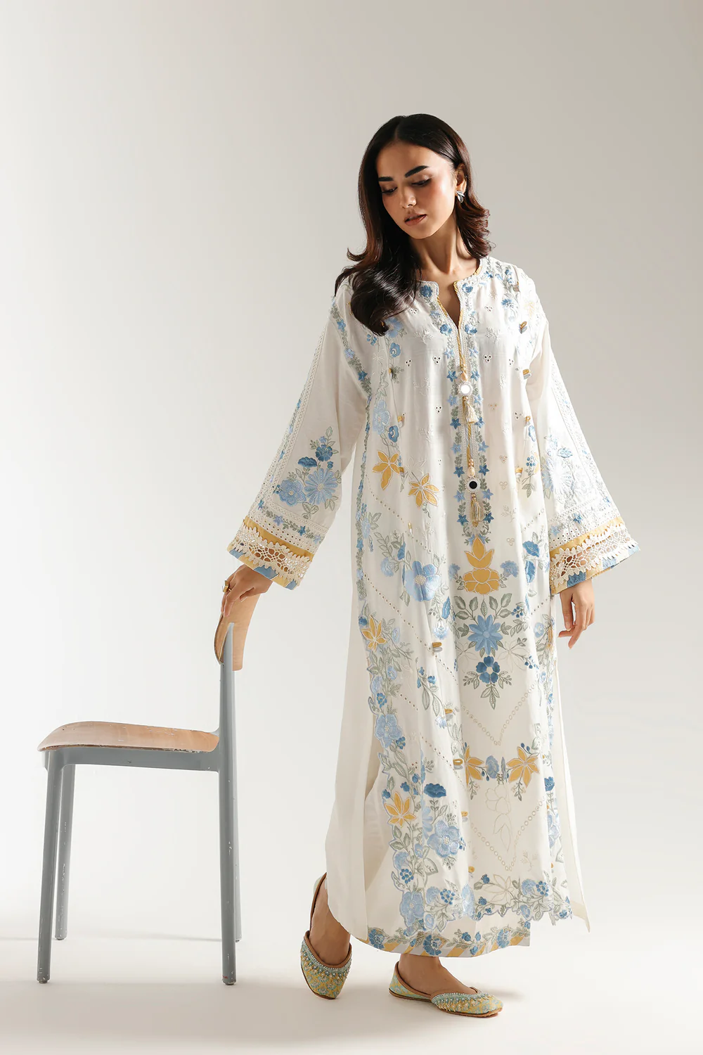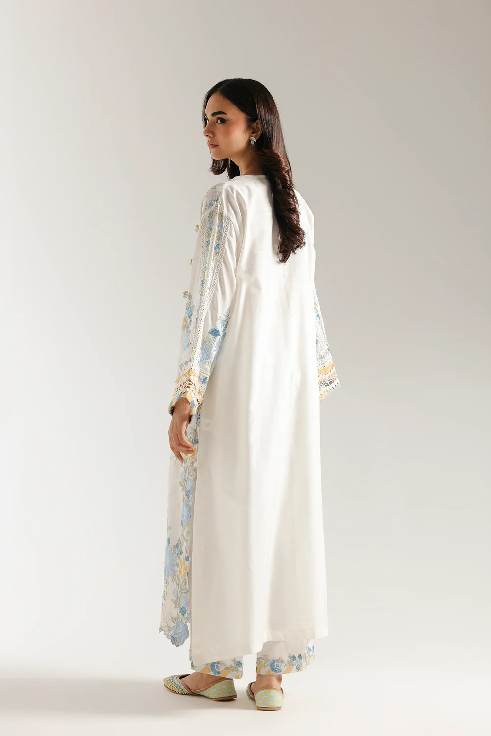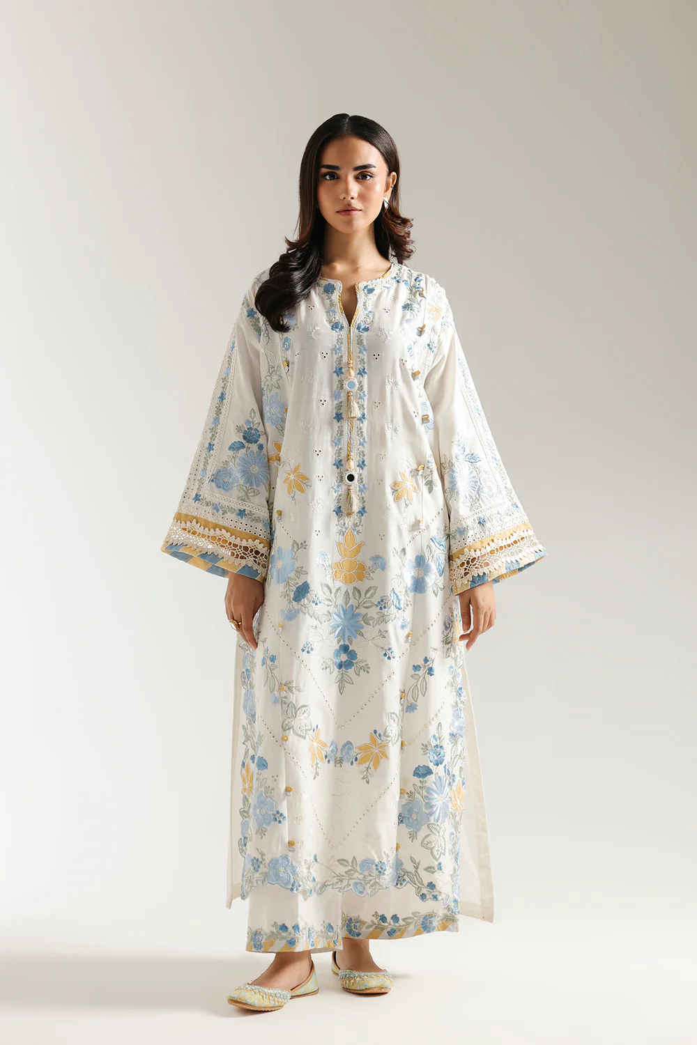 This elegant embroidered suit is a beautiful display of artistry. The soft, off-white kurta features a charming mix of printed and embroidered floral motifs in a soothing blue and yellow palette. With its detailed sleeves and a perfectly coordinated trouser, this ensemble creates a fresh and sophisticated look.