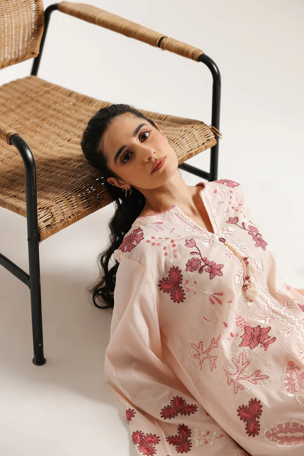 Step into striking elegance with this captivating embroidered suit. This two-piece ensemble features a timeless black kurta, beautifully adorned with intricate white embroidery that creates a mesmerizing contrast. The delicate patterns grace the neckline, sleeves, and hem, adding a touch of artisanal charm. Paired with wide-leg white shalwar, also detailed with coordinating embroidery at the hem, this suit offers a sophisticated and harmonious look that is perfect for any occasion.