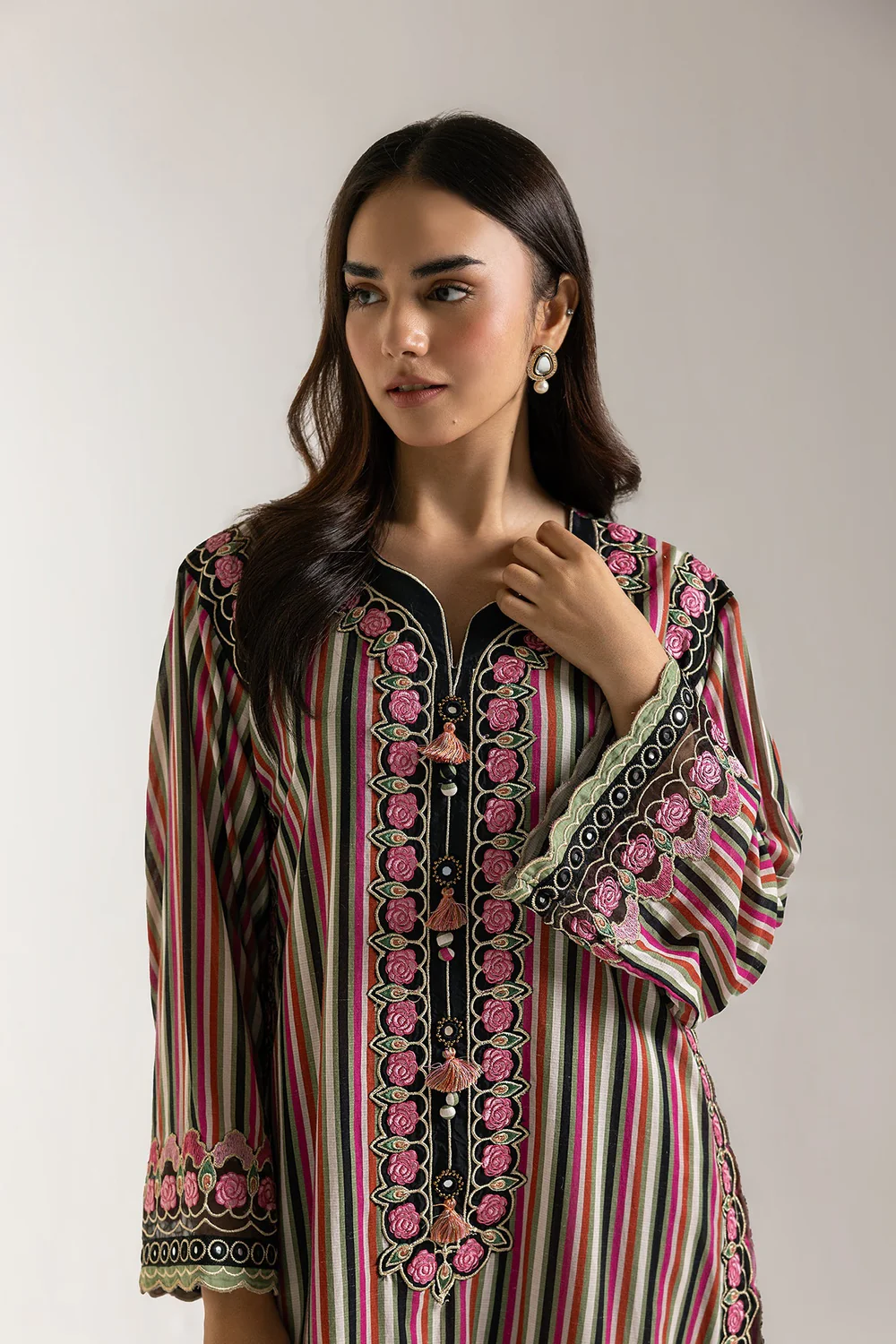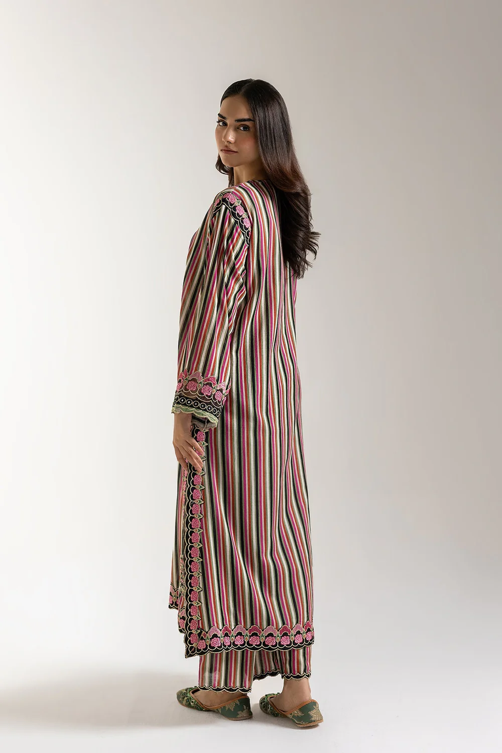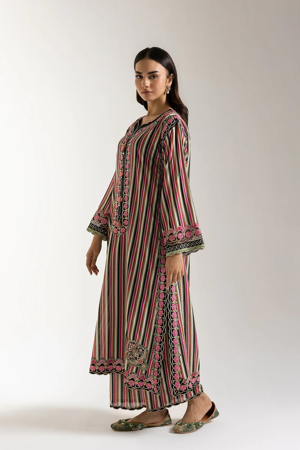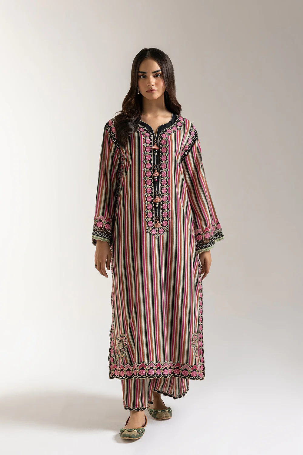 Embrace a captivating fusion of bohemian flair and refined elegance with our bohemian rhapsody ensemble. This striking two-piece ensemble features a kurti adorned with vibrant multi-colored vertical stripes in hues of pink, red, green, and black, creating a visually dynamic effect. The neckline and cuffs are beautifully highlighted with intricate embroidery and button details, adding a sophisticated touch. Paired with coordinating trousers that mirror the colorful striped pattern and feature delicate embroidery along the hem, this outfit offers a harmonious blend of comfort and distinct style. Ideal for festive gatherings, artistic events, or making a bold yet elegant statement.