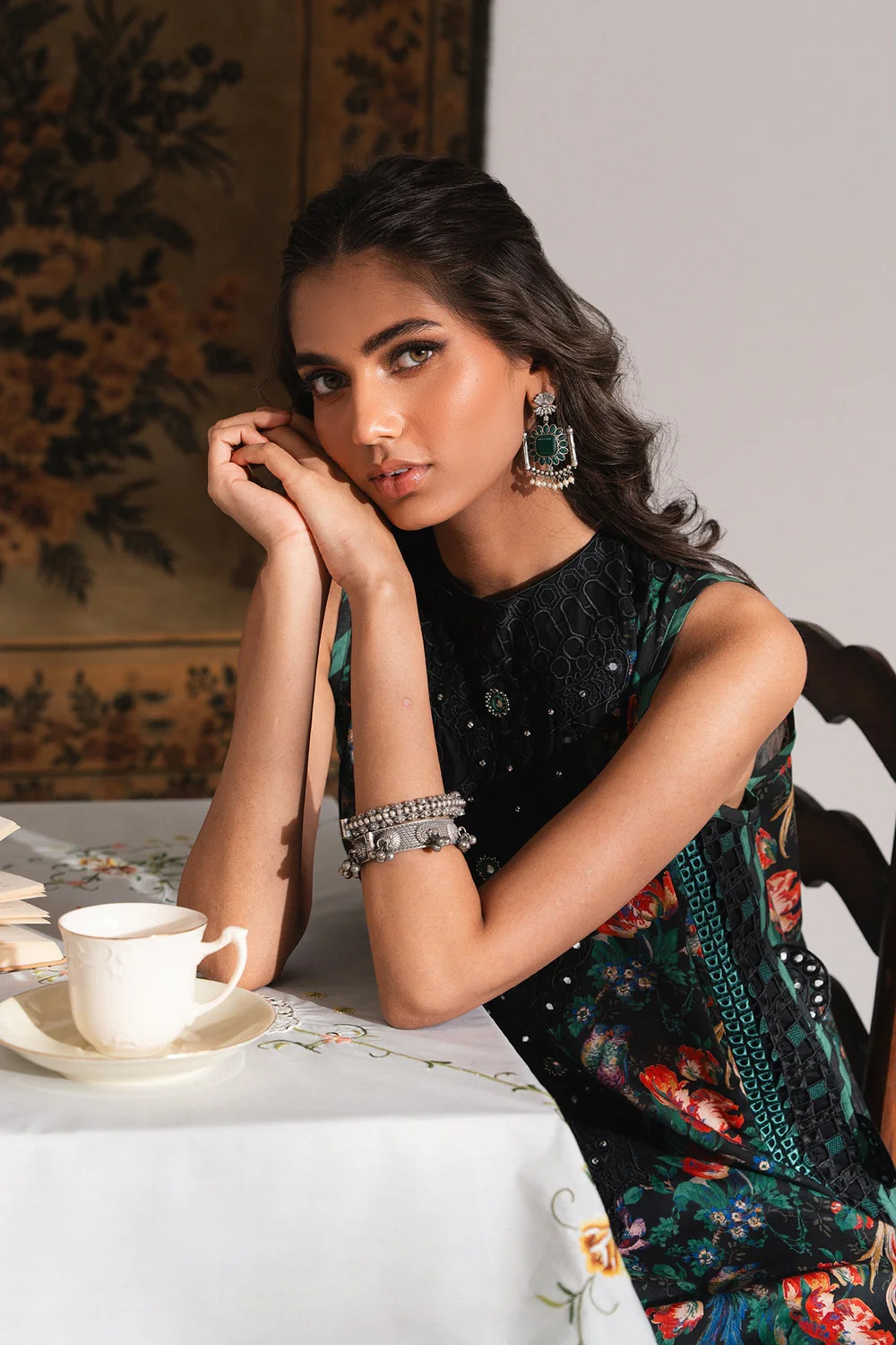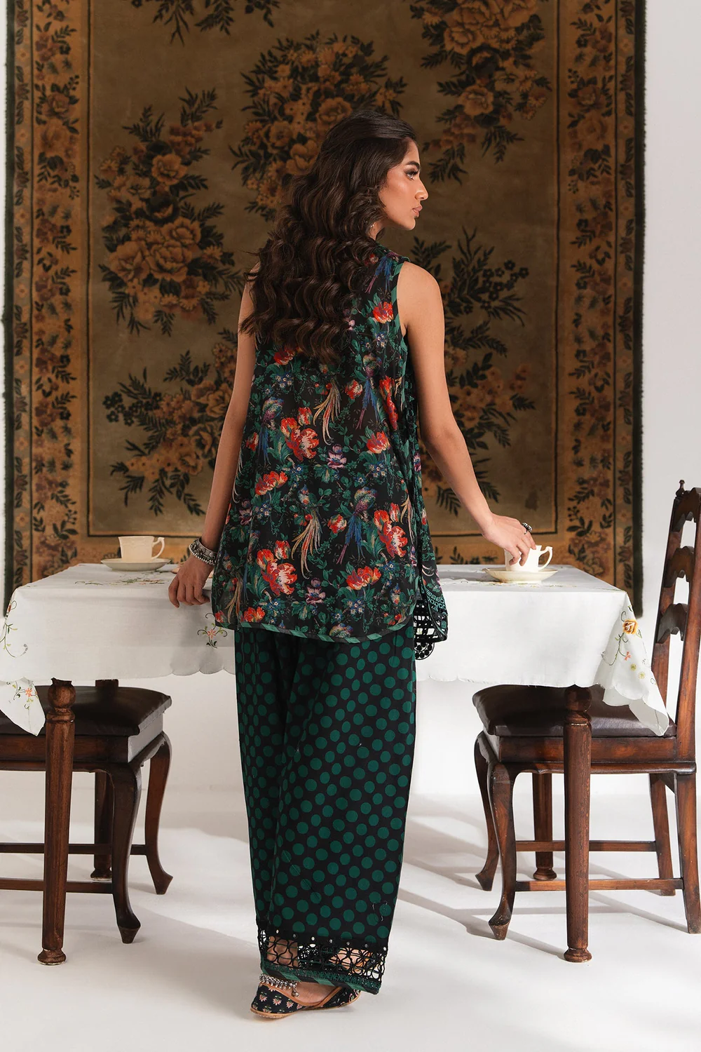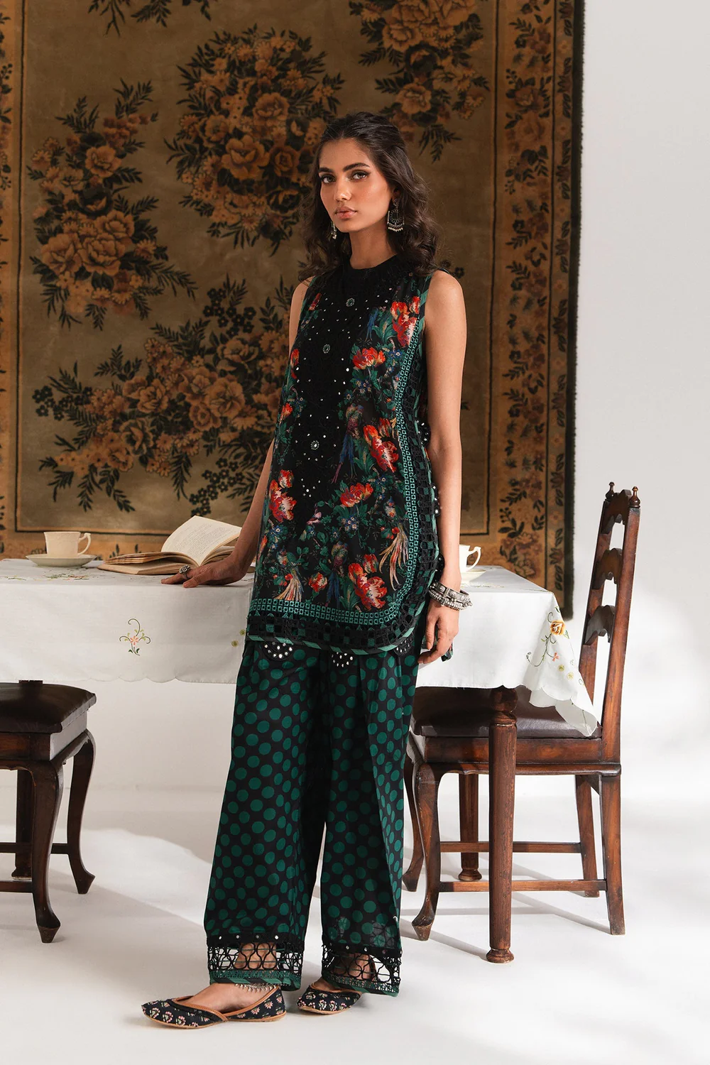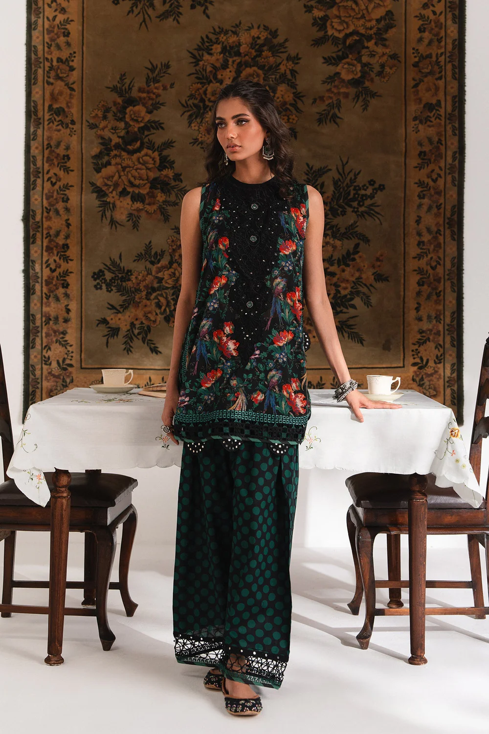 Step into a scene of opulent beauty with our enchanted garden suit, a striking ensemble that marries dark allure with vibrant design. This captivating two-piece features a sophisticated black sleeveless tunic, adorned with a breathtaking, rich floral print in deep reds, greens, and blues, reminiscent of a hidden paradise. Intricate embellishments and delicate embroidered detailing grace the neckline, adding a touch of luxurious sparkle. Paired with coordinating dark green polka-dot farshi shalwar, which carry subtle embellishments at the hem, this outfit creates a truly harmonious and impactful statement. Perfect for grand evenings, celebratory events, or making an unforgettable impression.